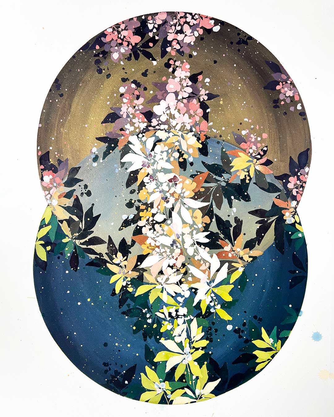 Celestial Alignment is an original sun and moon watercolor painting filled with seasonal flowers and leaves, symbolizing balance, cycles, and interconnectedness.