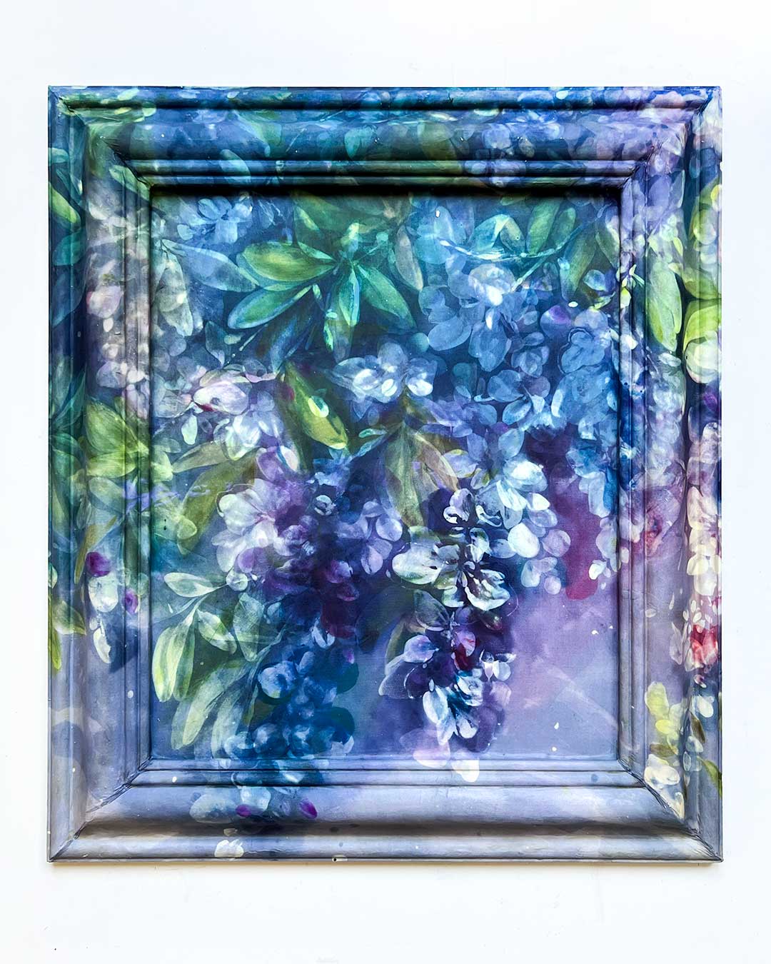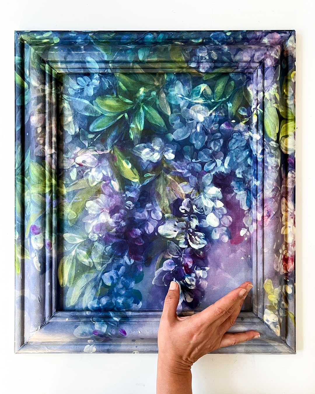 This piece is carefully mounted on a custom-prepared wooden frame using museum-quality materials, creating a soft, fabric-like surface with a painterly presence. The surface is then sealed with UV-protective varnish for longevity.