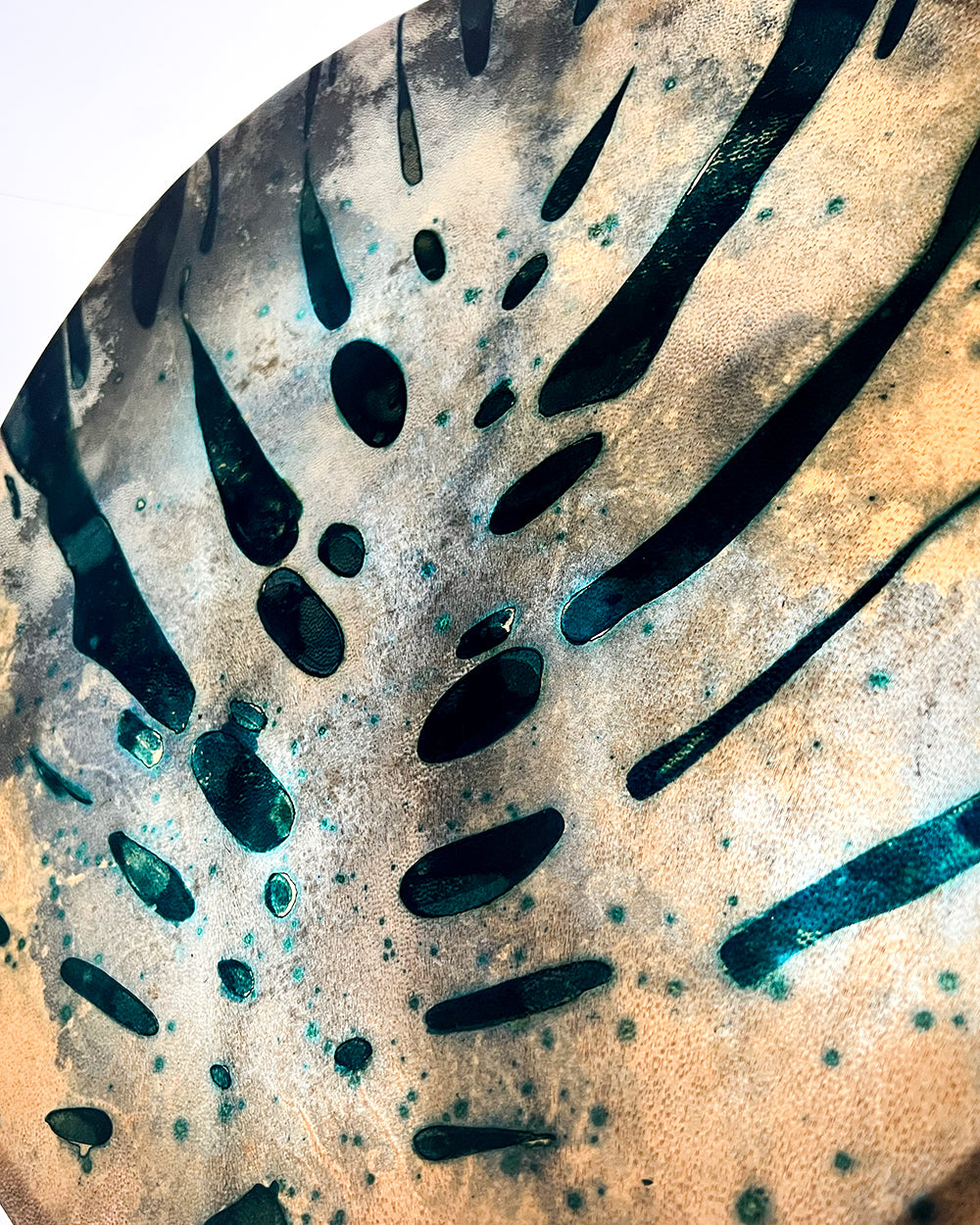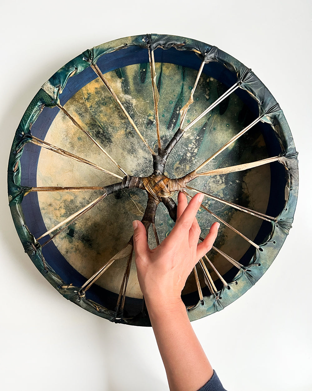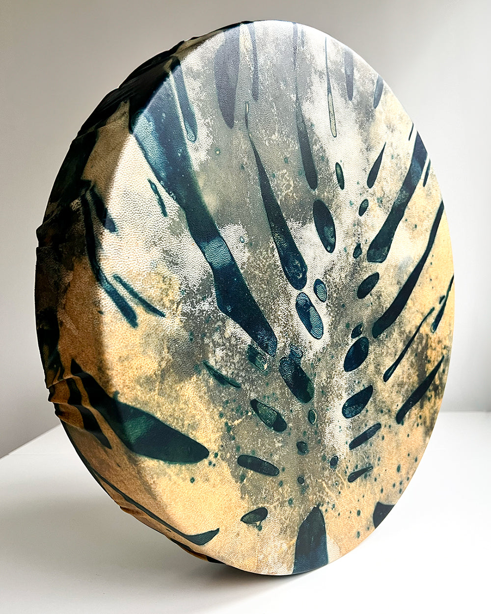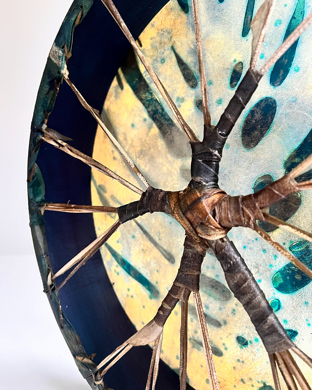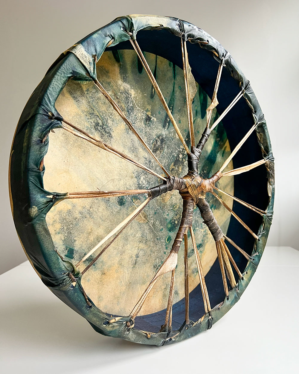 Finished with rim lacing, the drum has a clean, intentional edge that frames the organic leaf imprint beautifully. The deep blue hoop adds contrast and depth, grounding the brightness of the hide while echoing the night sky that holds the full moon.