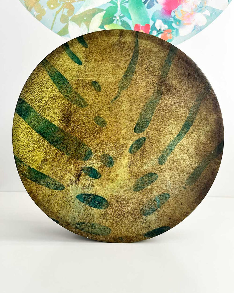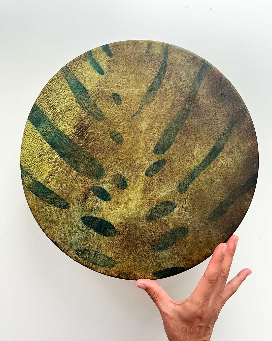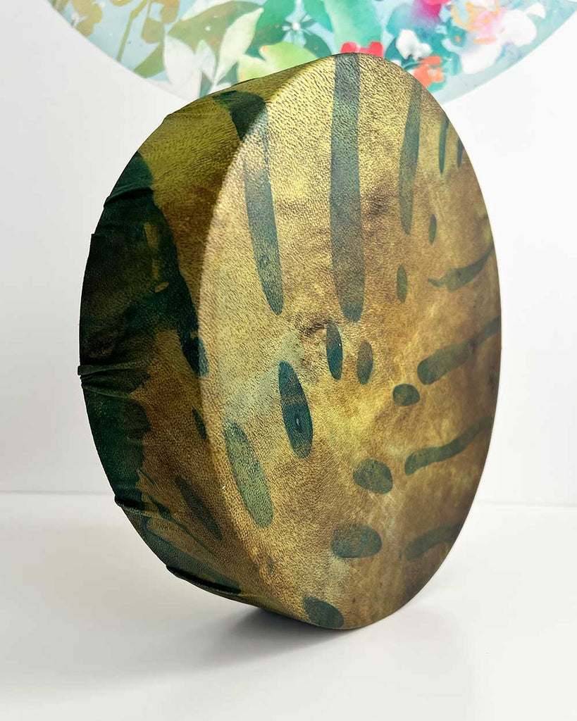 The willow hoop is lovingly hand-painted with touches of gold, while the goat hide is printed with a cyanotype Monstera leaf pattern and accented with natural green dyes. Earthy greens and shimmering gold flow across the surface, evoking the energy of fertile forests and the quiet magic of the jungle.